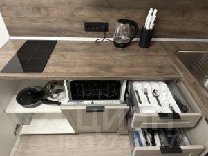 В кухни имеется посудомоечная машина плита, микроволновая печь. хололильник столовые приборы, посуда, сковородаи кастрюля, модульный раскладной диван
