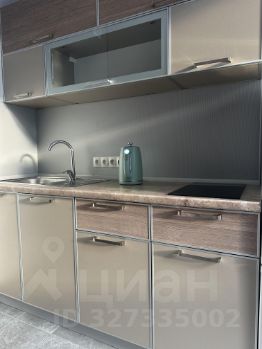 В зоне кухни установлен холодильник, встроенный кухонный гарнитур, варочная панель новая, чайник, стол и два стула - новые. Также у окна размещен диван с двумя подушками и системой хранения внутри.