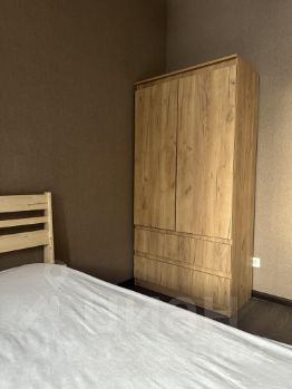 В спальной зоне разместили новую деревянную кровать с новым матрасом, шкаф новый, торшер и прикроватный столик новые.