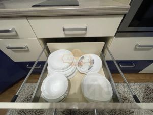 В кухне: электрическая плита на две конфорки, духовой шкаф, встроенный холодильник, посудомоечная и стиральная машины, электрический чайник, стол, стулья.