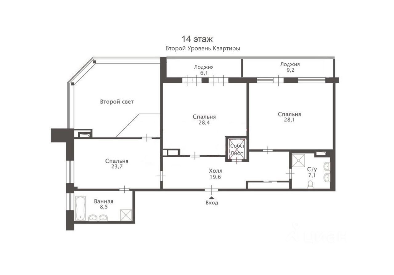 • Две спальни 28,4 м² и 28,1 м² — каждая со своей панорамной утепленной лоджией