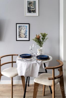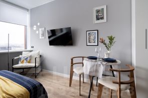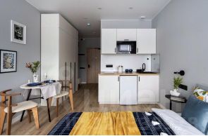 - -обеденная зона (холодильник, чайник, микроволновка, плита, столовая группа, посуда на 2 персоны, стол со стульями)