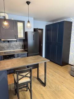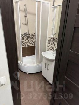 Кухонный гарнитур с необходимой техникой,барная стойка, диван, шкаф, холодильник, телевизор,Санузел с душевой кабиной и стиральной машиной. Огромная с панорамными окнами застекленная лоджия. Вид во двор.Автобусная остановка на против подъезда,начальная и конечная остановка 2 минуты ходьбы