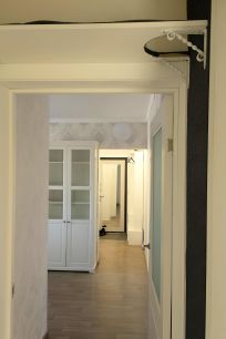 Также в квартире предусмотрено место для проживания 1-2 кошек: когтеточка-лазалка от пола до потолка с высокой полкой для пушистых верхолазов. В прихожей вместительный шкаф-кладовка для 2-3 велосипедов и местом для размещения кошачьего туалета.