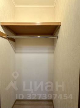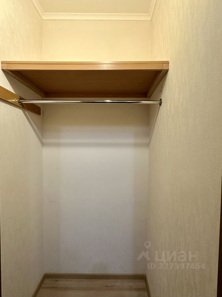 Отдельная гардеробная с кронштейном и полкой, хорошо освещена и закрывается дверью.