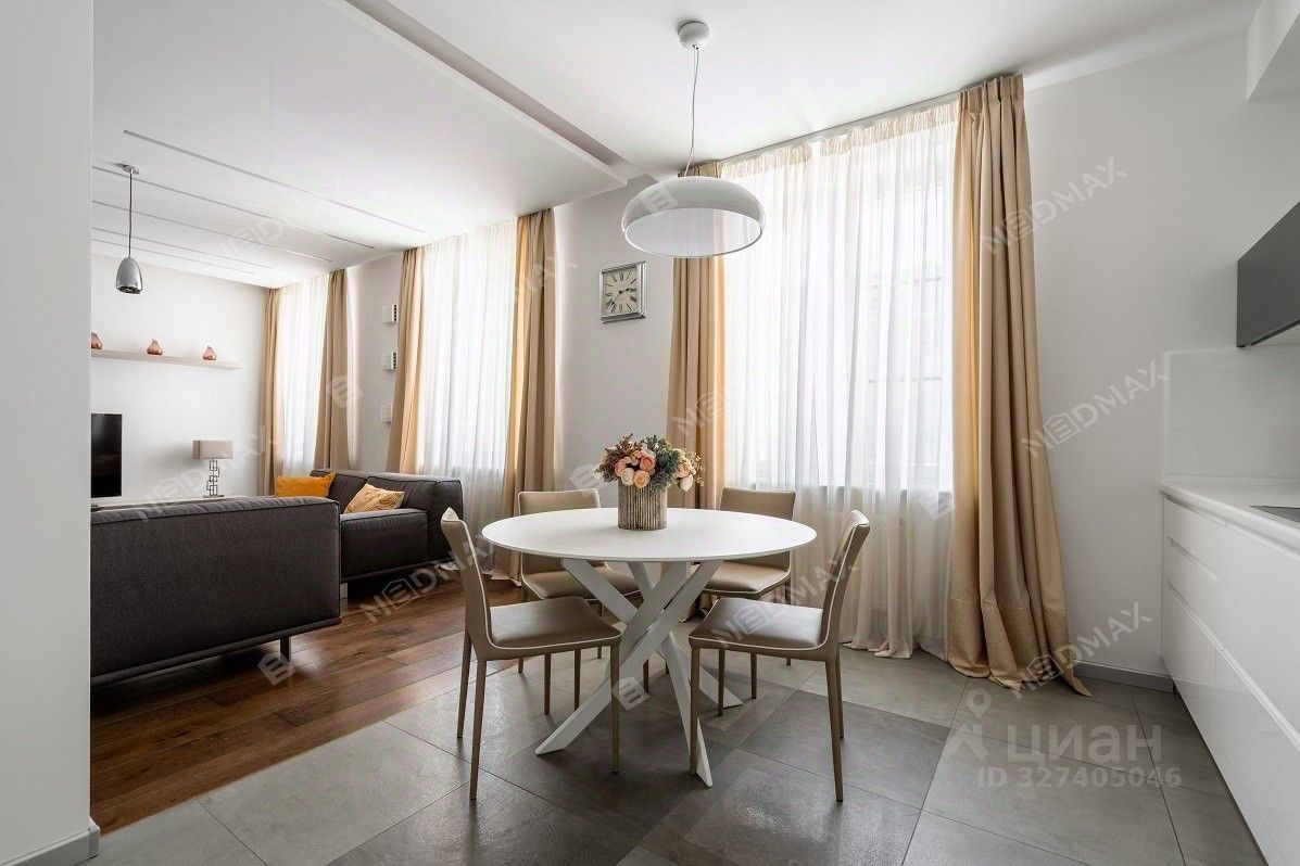 Планировка - уютная спальня, гостевая комната/кабинет, просторная гостиная с выделенной зоной кухни - столовой, два санузла. Комфортабельная мебель (на заказ), сантехника элитных мировых брендов. Окна спальни и кабинета выходят на восток, окна гостиной с кухней-столовой на запад. Высокие потолки и большие окна создают ощущение обилия света и воздуха.