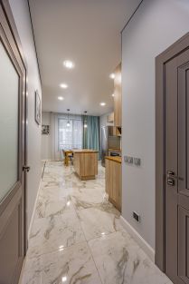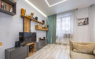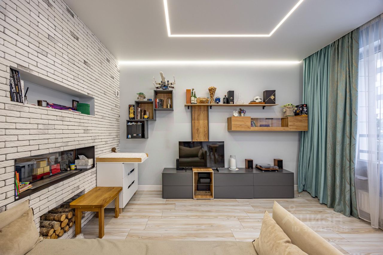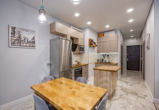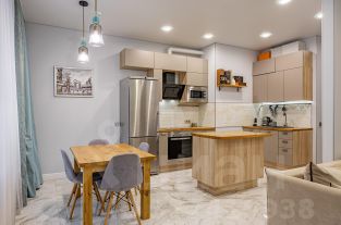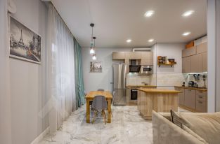 В квартире очень уютная и светлая кухня-столовая, гостиная с комфортным раскладными диваном, с которого приятно вечерами наблюдать за живым огнём в камине. Кухонная зона очень удобна и имеет всю необходимую технику.