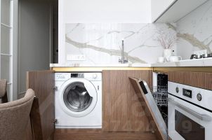 Уютная кухня оборудована современной техникой: посудомойка, микроволновка, духовка, большой встроенный холодильник, стиральная машина с сушкой.