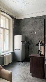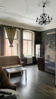 Высокие потолки 3,6 м с аутентичной лепниной, три огромных окна — заливают пространство естественным светом весь день.