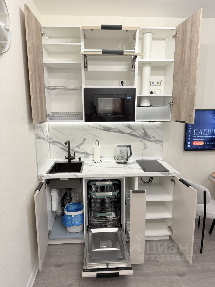 Сама кухня компактная, но очень вместительная, мест для хранения достаточно. Есть сенсерное управление подсветкой с регулировкой ярокости. Установлены фильтры с тройной степенью очистки воды, не нужно захлямлять рабочую поверхность отдельными фильтрами.
