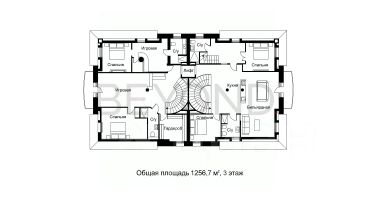 Первый этаж включает кухню-столовую, гостиную с камином и кабинет. На втором — мастер-сьют с гардеробной и ванной, детская спальня с игровой, отдельной ванной комнатой и хозяйственное помещение. На третьем — две детские спальни и большая игровая зона с кухней.