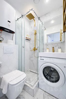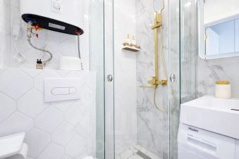 Душ, стиральная машина, чистые полотенца, жидкое мыло для рук, шампунь/гель для душа