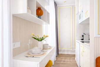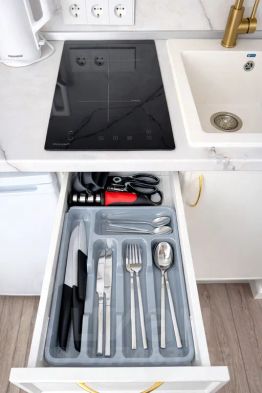 Кухня со всем необходимым. Индукционная плита, холодильник, чайник, микроволновая печь, вся необходимая посуда и кухонные принадлежности;