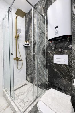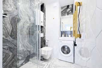 Душ, стиральная машина, чистые полотенца, жидкое мыло для рук, шампунь/гель для душа