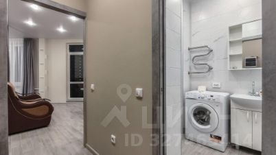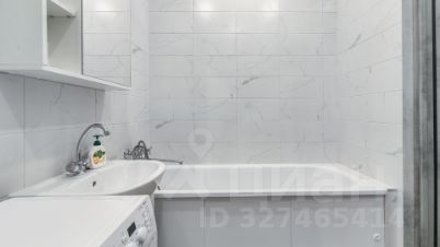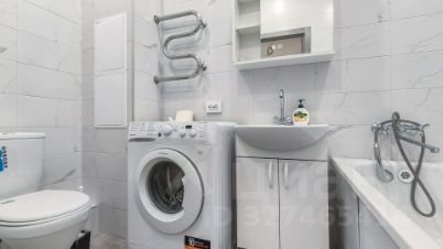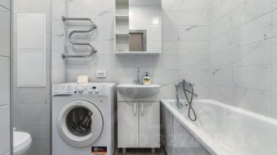 Санузел выполнен в кафельной плитке, здесь нашлось место полноценной ванне, что редко встречается в студиях! Стиральная машина установлена рядом.