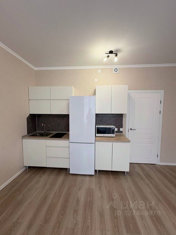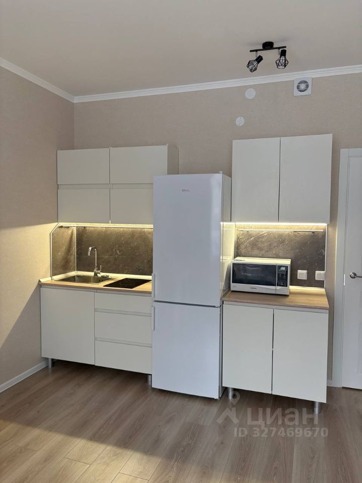 - Кухня с холодильником, плитой и микроволновой печью.