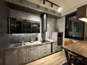 Сердце квартиры — кухня-гостиная, где дизайн достигает своей кульминации. Здесь установлена премиальная встроенная техника, но главное — это эксклюзивная мебель, сваренная из металла вручную.