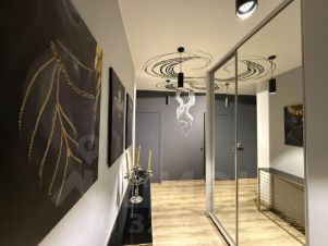 Авторская графика. Петербургский художник не просто оформил стены — он создал для этого дома серию графических работ. В прихожей вас встречают три оригинальные картины, задающие тон всей квартире. Роспись стен в градациях серого превращает гостиную в камерное лофт-пространство, где игра света и тени важнее кричащих красок.