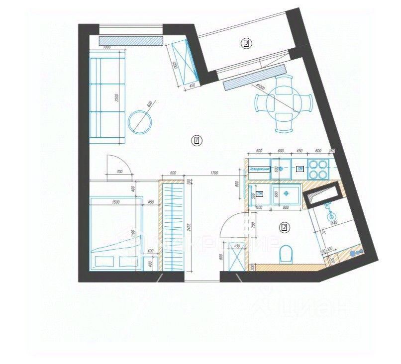 Выполнено зонирование на спальную, гостиную и кухонную зону.