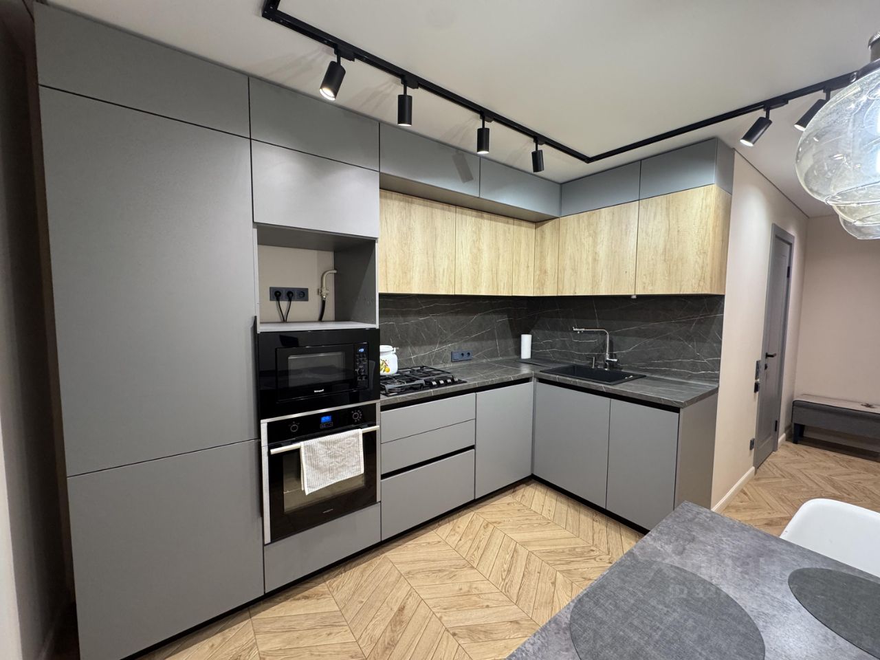 Полностью оборудованная кухня с выходом на лоджию ( холодильник , микроволновая печь , духовка , посудомоечная машины , чайник , посуда и приборы )