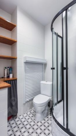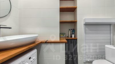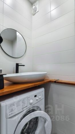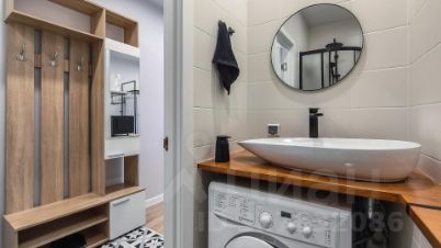 Ванная комната выполнена в кафельной плитке, здесь размещена душевая кабина, стиральная машина, раковина и зеркало. Вытяжка включается вместе со светом.