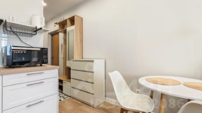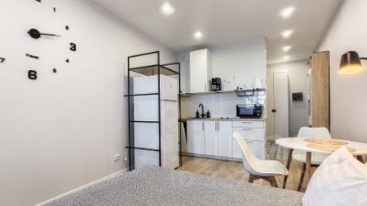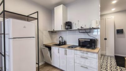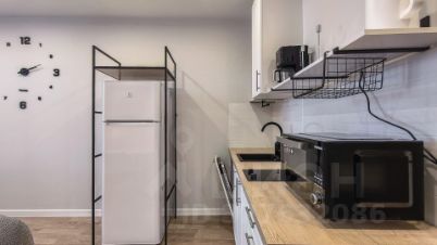 На кухне установлен как гарнитур с мойкой и фильтрами, бытовая техника, так и полочки. Варочная поверхность, встроенная посудомоечная машина, вместительный холодильник, а также набор небольшой кухонной техники: СВЧ-печь, электрочайник, капельная кофеварка.