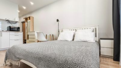 Начнём со спального места: широкая удобная кровать с изголовьем и прикроватной тумбой уже здесь.