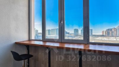 Лоджия ухоженная, есть встроенная столешница, есть барный стул, установлено освещение. На горизонте виден Залив.