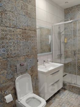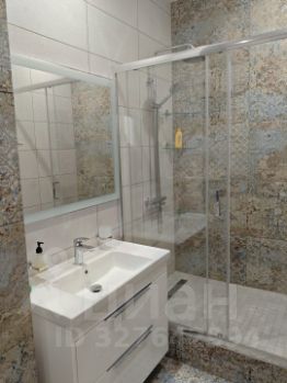 Большая 6-метровая ванная комната с прекрасной плиткой из Сквирел, зеркало с сенсорной подсветкой, качественная сантехника, душевая зона со стеклянной раздвижной перегородкой, полотенцесушитель с регулировкой температуры, стиральная машина.