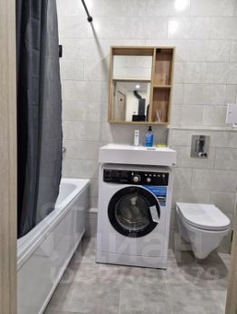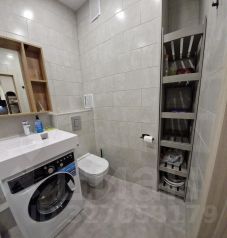 Санузел совмещенный. Установлена стиральная машина, полноразмерная ванная, стеллаж для хозяйственных принадлежностей.