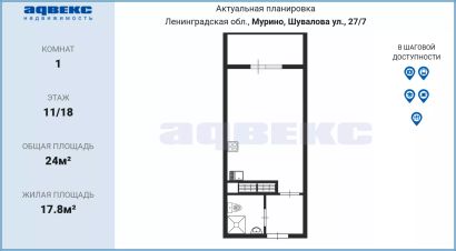 Сдается квартира-студия в ЖК "Гринландия"! В квартире просторная комната правильной квадратной формы 17.8 кв.м., санузел 3.1 кв.м, прихожая 2.9 кв.м, лоджия 5.2 кв.м., очень вместительная. Общая площадь квартиры составляет 24 кв. м, высота потолков — 2.8 метра. Просмотры с 20.03.26г.