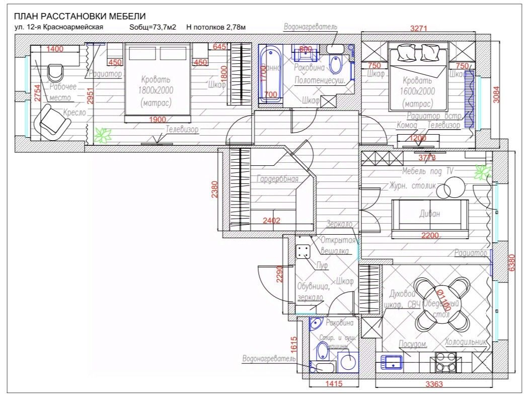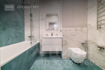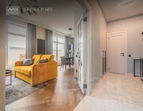 Общая площадь 76 м2, комфортная, двустороння планировка, просторная гостиная с выходом на балкон, основная спальня с выделенной зоной для кабинета и гостевая спальня. Два сан.узла, в одном из которых установлена стиральная и сушильная машина.