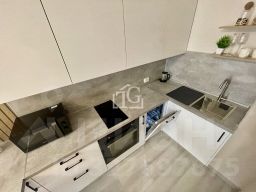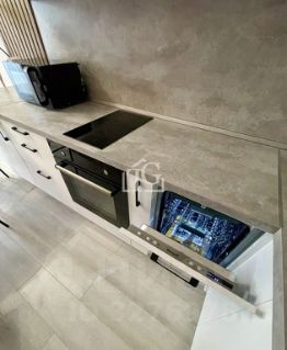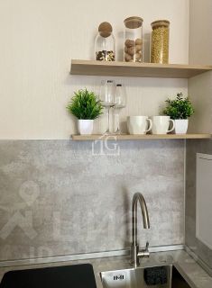 Кухня оборудована, большой объём хранения. Варочная панель, духовой шкаф, вытяжка, посудомоечная машина, СВЧ, электрический чайник. Двухкамерный холодильник. Есть необходимая посуда и приборы.