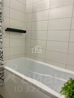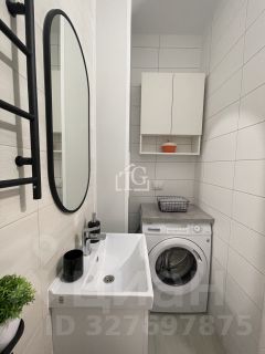 В ванной комнате стиральная машина горизонтальной загрузки. Подогрев пола.