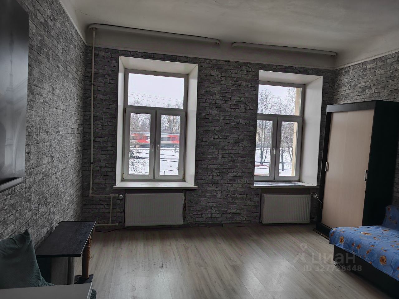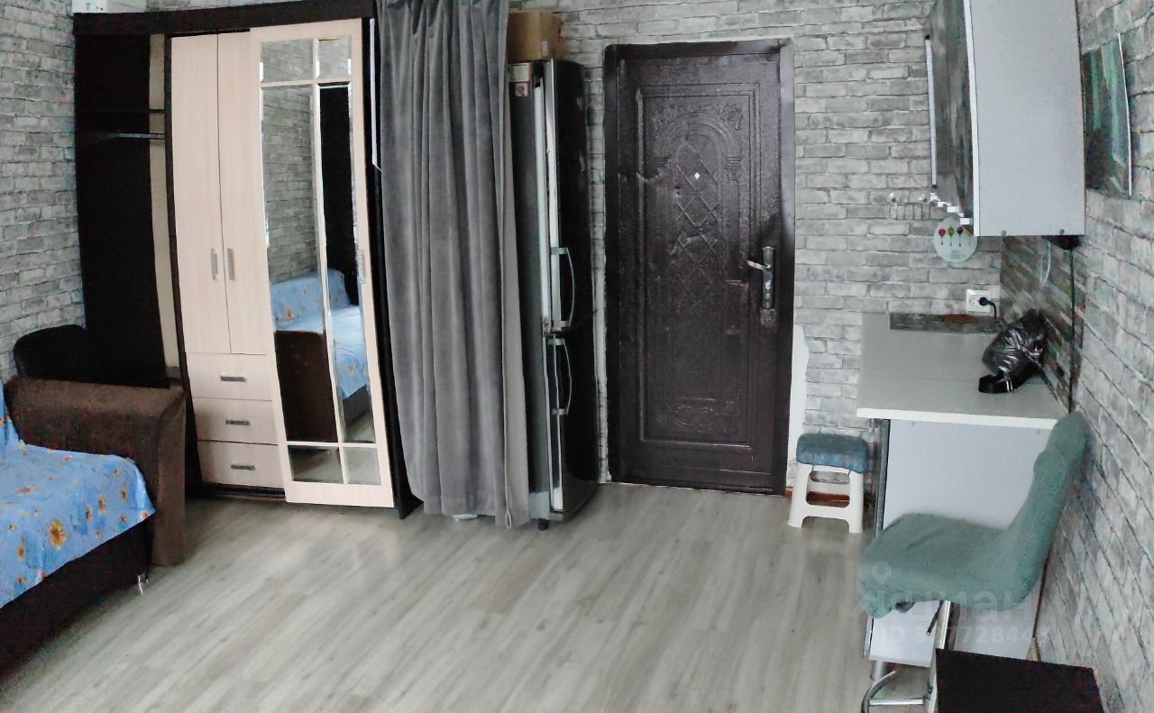 Есть всё необходимое для жизни: диван раскладной двухспальный, шкаф-купе большой, кухонный гарнитур, столик, холодильник. Окна выходят на улицу, в комнате светло и тепло.