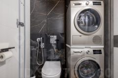 Современный дизайн: инсталляция, гигиенический душ, стиральная и сушильная машины. Ниша для бытовой химии, зеркало с подсветкой.