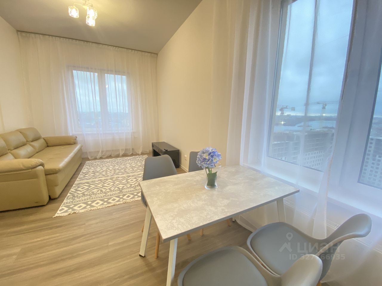 В кухне-гостиной есть вся необходимая техника: холодильник, варочная поверхность и духовой шкаф. Обеденный стол, рассчитанный на 4-х человек. С другой стороны, в зоне гостиной стоит уютный диван, стильный и функциональный музыкальный центр. Из кухни-гостиной открывается красивый вид на Неву.