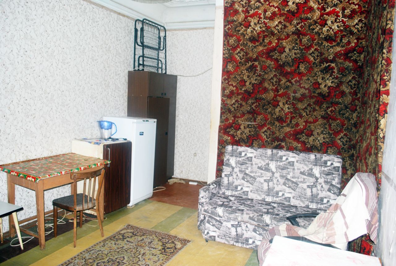 КОМНАТА - 19 кв.м. , 2 окна. Высокие потолки 3,2 м. В комнате вся мебель, 3 шкафа, два 2-х спальных дивана, раскладушка, письменный стол, обеденный стол, два кресла, два холодильника, стиральная машина, электрочайник, посуда.