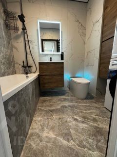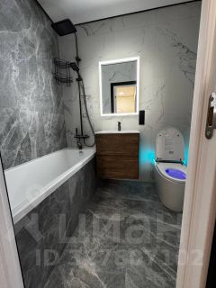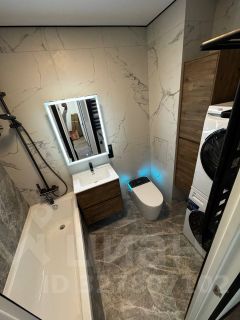 Санузел совмещённый и оборудован ванной с современным смесителем, полотенцесушителем, зеркалом-шкафом с подсветкой, установлены шкаф для хранения, стиральная и сушильная машины, а также умный унитаз с авто открыванием и закрыванием крышки, с подогревом сидения и другими полезными функциями.