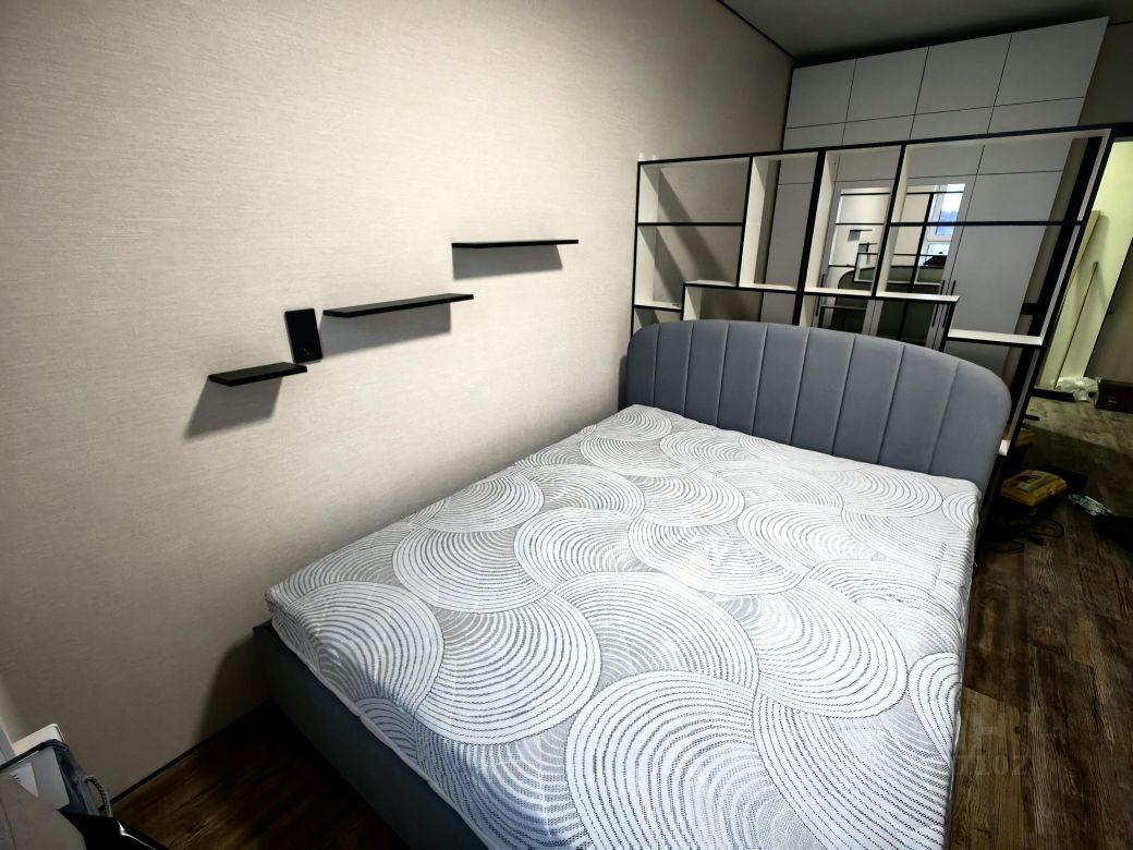 В комнате также предусмотрена мебель для комфортного проживания: мягкая просторная кровать 160*200 с ортопедическим матрасом и комплектом постельного белья, вместительный шкаф с зеркальными дверями, шкаф-стеллаж, торшер и место для рабочей или детской зоны.