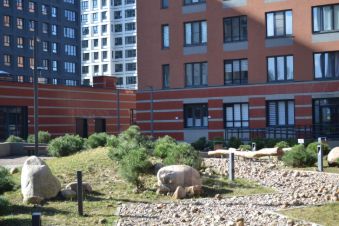 Вокруг: зелёные дворики с детскими и спортивными площадками, столы для игры в настольный теннис, территории для прогулок и отдыха, и многое другое.