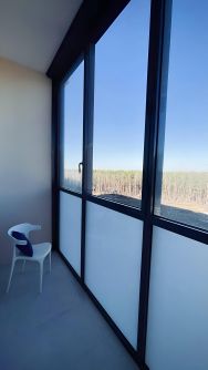 Из окон открывается живописный вид на лес, который создаёт ощущение спокойствия и пространства.