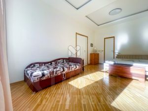 Светлый зал в свежих тонах с большой кроватью и ортопедическим матрасом , телевизором, камодом и уютным диваном