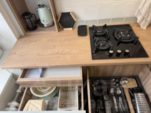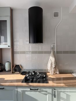 -Полноразмерная посудомоечная машина, газовая плита с электроподжигом, чайник, микроволновая печь, духовой шкаф, встроенный большой холодильник, вытяжка, посуда и столовые приборы