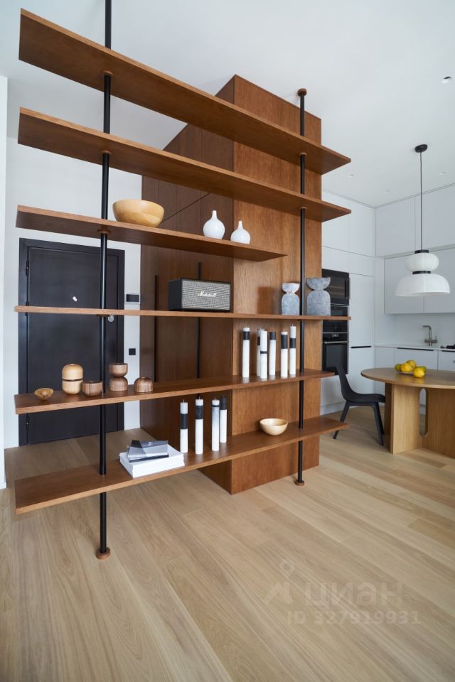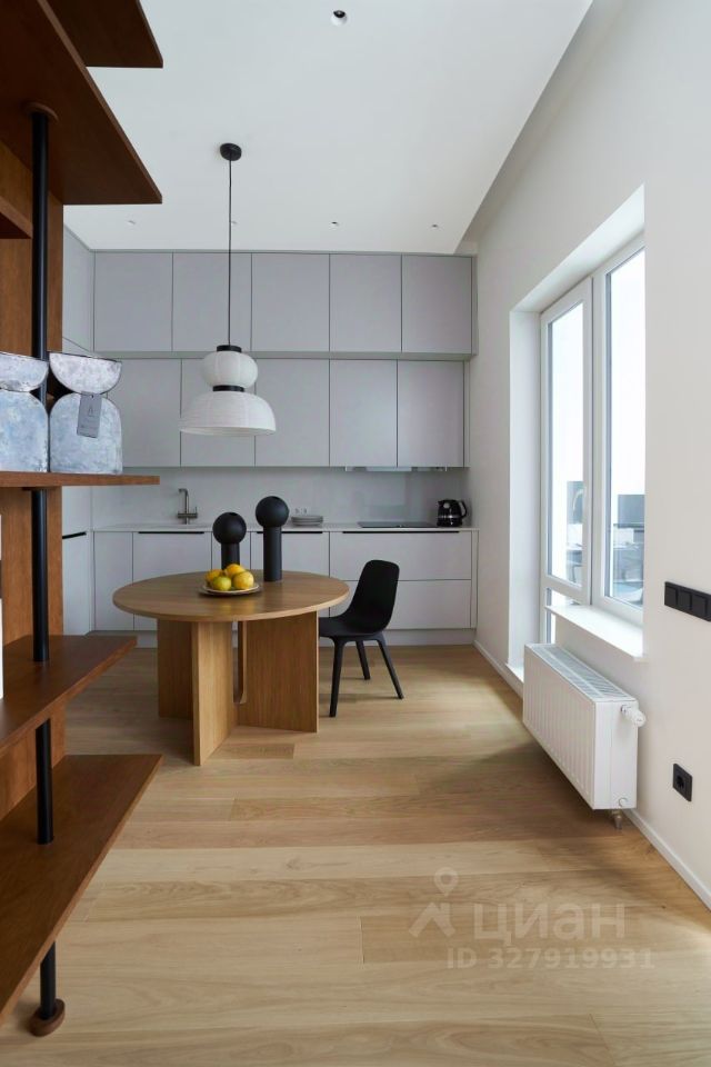 Интерьер выполнен в современном минималистичном стиле с использованием качественных материалов: натуральное дерево, встроенная мебель, продуманное освещение.