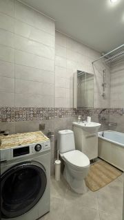 Удобства — просторный совмещённый санузел с ванной (большая редкость для студии).