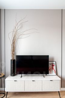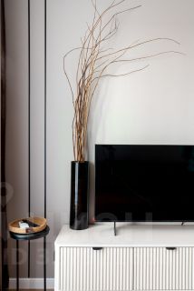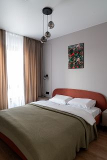 Спальня: Большая двуспальная кровать с ортопедическим матрасом и телевизор. Мягкое освещение бра и торшеров в квартире дарит приятную обстановку спокойствия после активного дня.