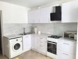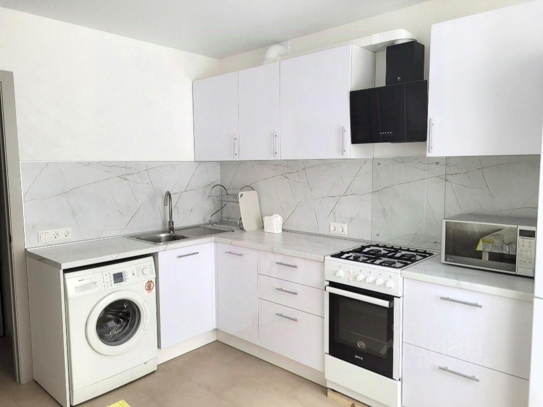 На кухне новая встроенная мебель с выкатными ящиками, газовая плита gorenje, холодильник Bosch, стиральная машина Bisch, также есть посуда.