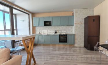 В гостиной раскладной диван, барный стол со стульями, встроенная кухня.