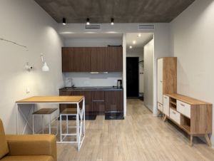 Планировка студии позволяет максимально эффективно использовать доступное пространство. В комнате и на кухне имеется вся необходимая мебель, установлена современная техника.
